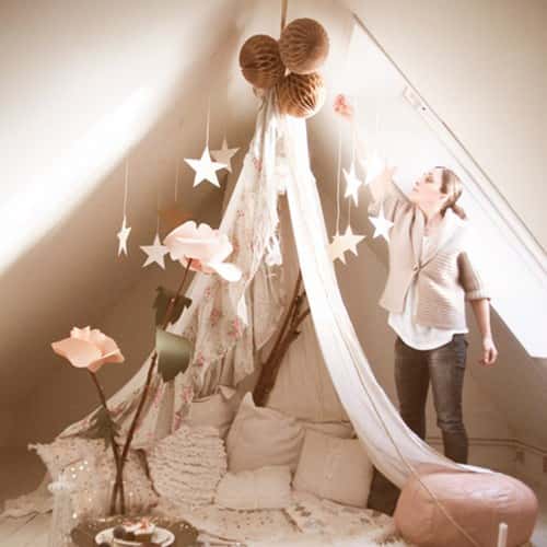 To ward off the winter blues, and to create a fun and pretty project together, try building an indoor fort. It is a sweet place for the kids to read at during the day, and with the addition of faux fire candlelight, a lovely place to snuggle up in at night.